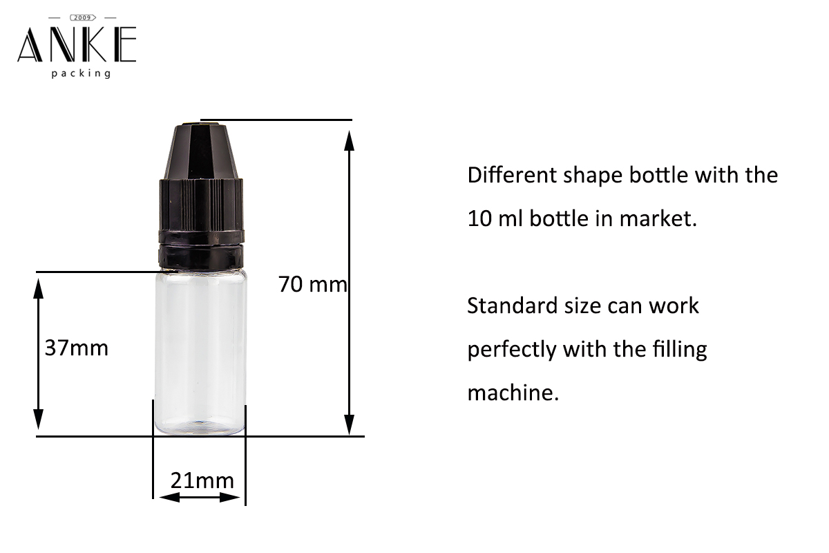 - Flacone trasparente da 10 ml TPD6 con tappo nero a prova di bambino.